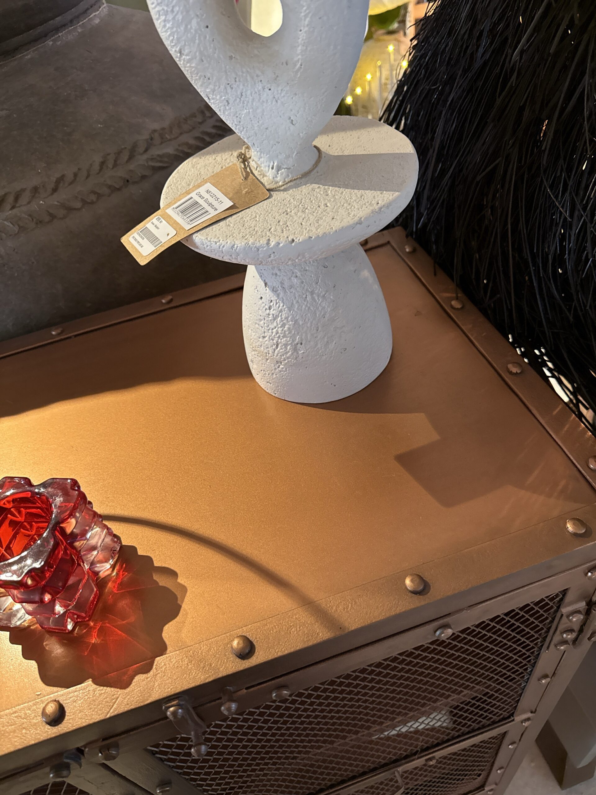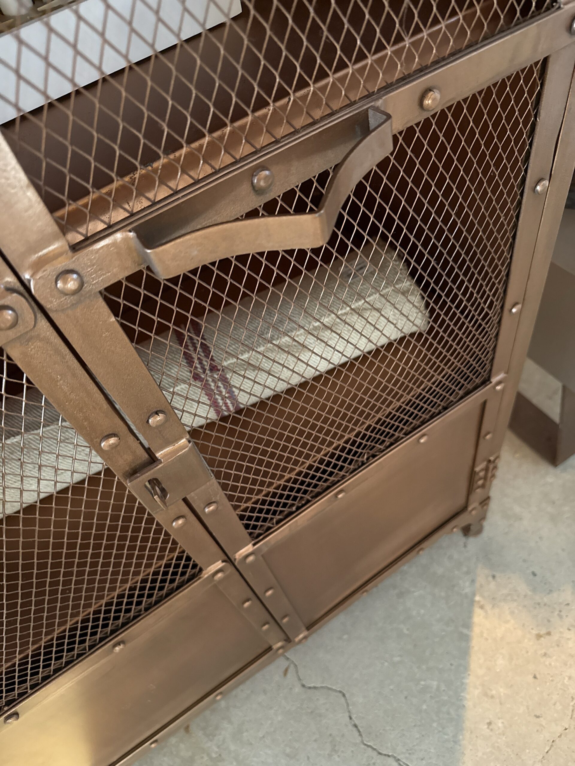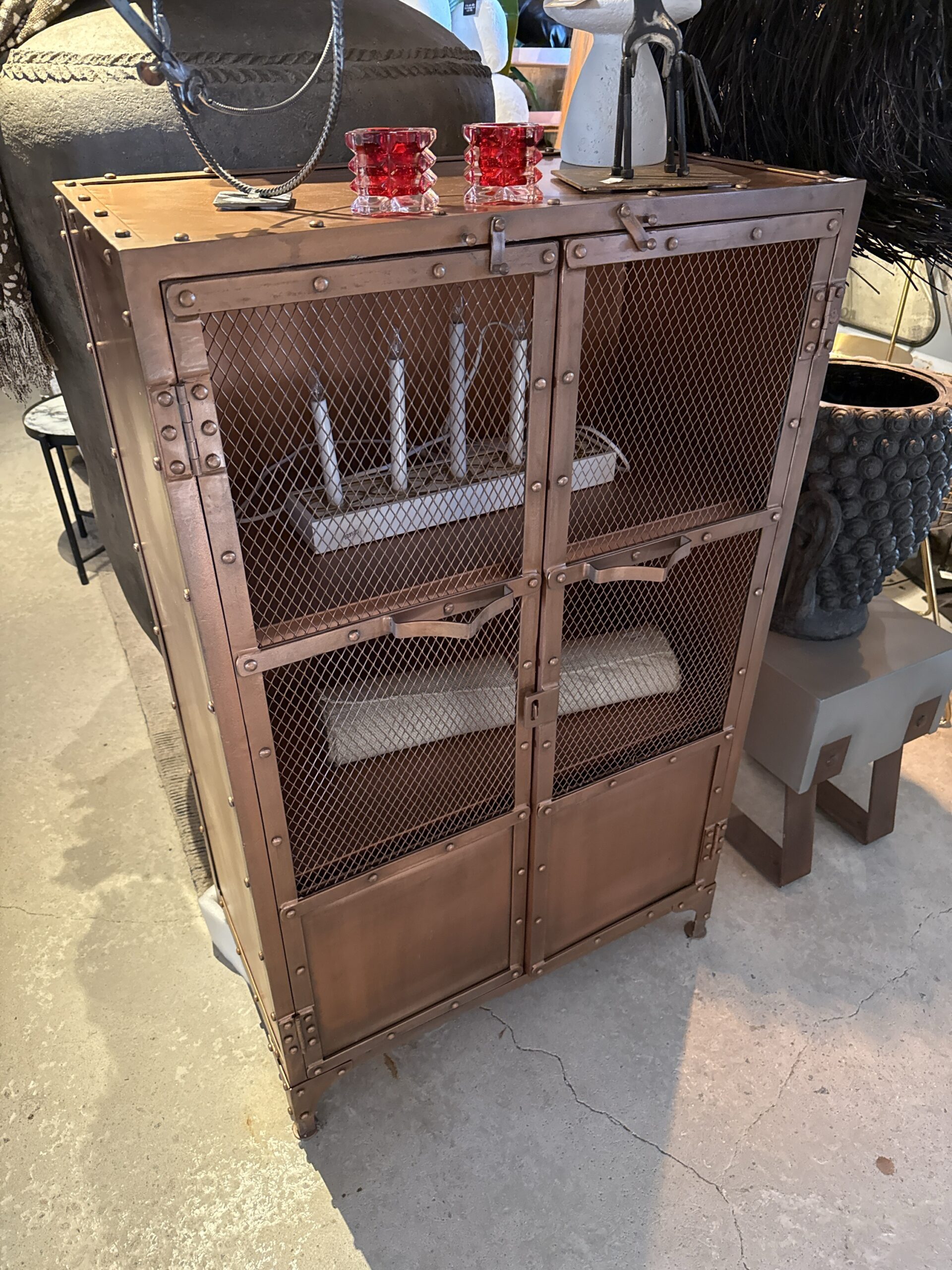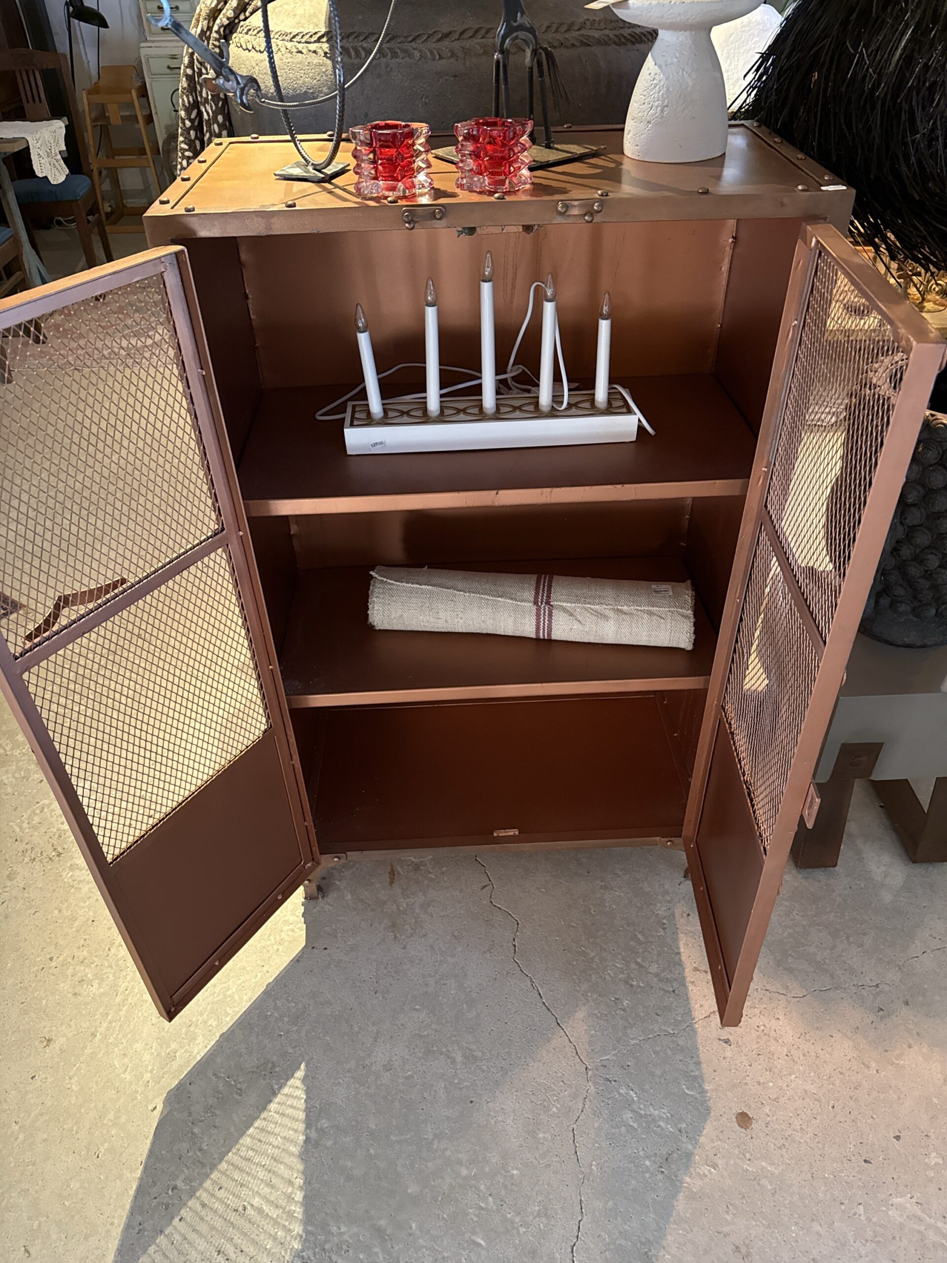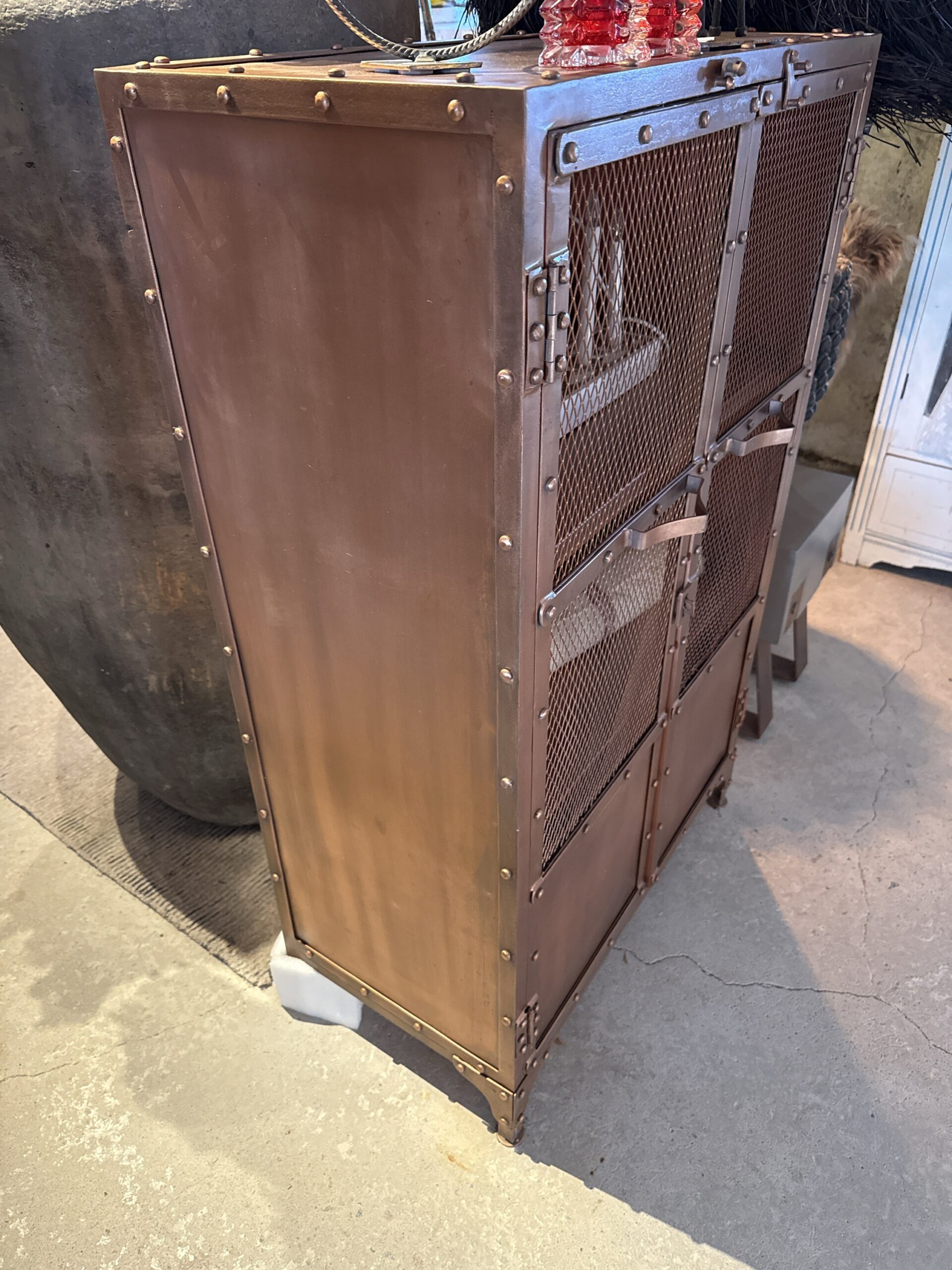 Läckert och mycket gediget skåp i obehandlad metall. Luckorna i dörren är gjorda av metallnät.
