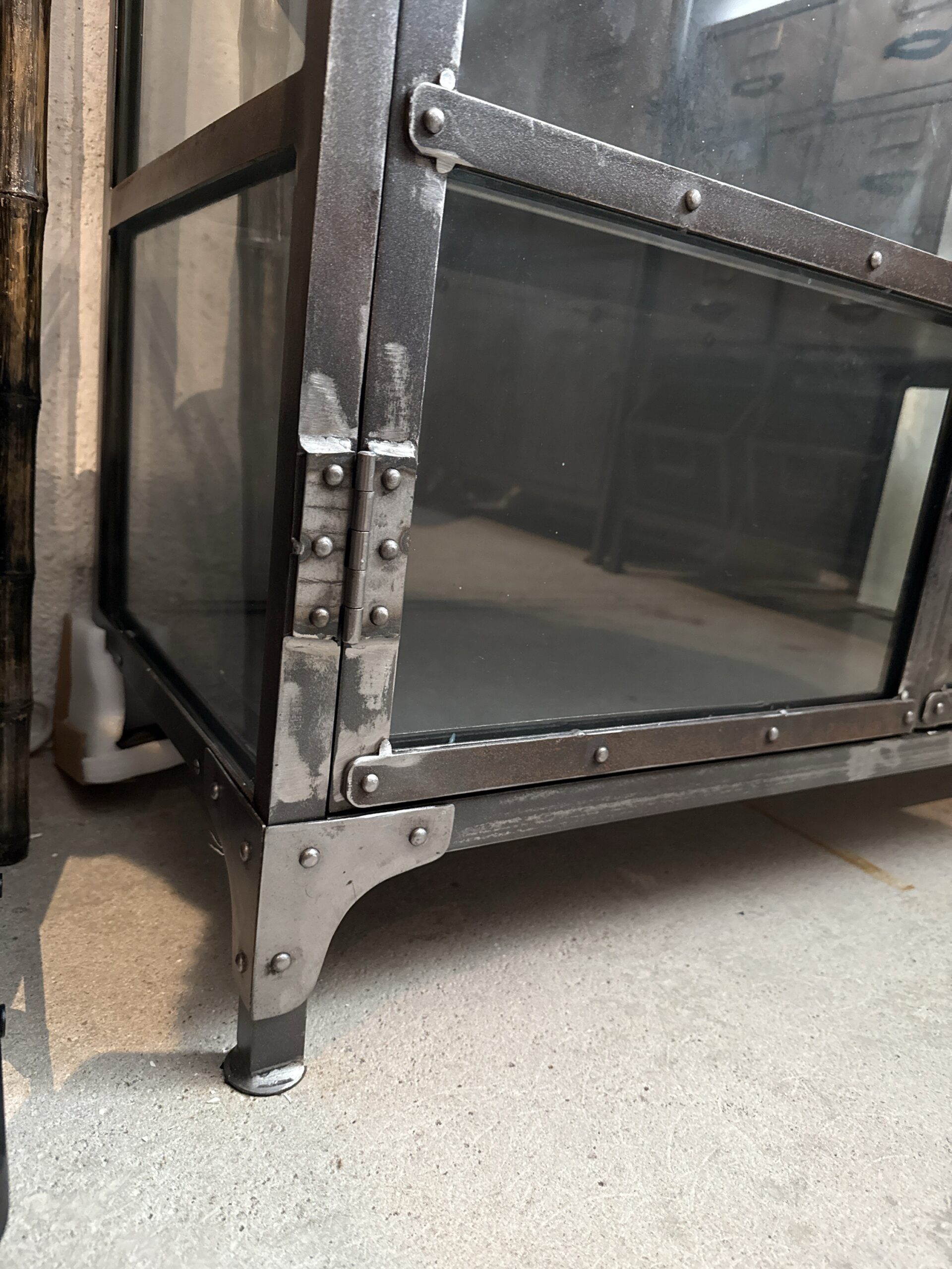Klarglas fram och på sidorna. Hyllplan och baksida är metall.