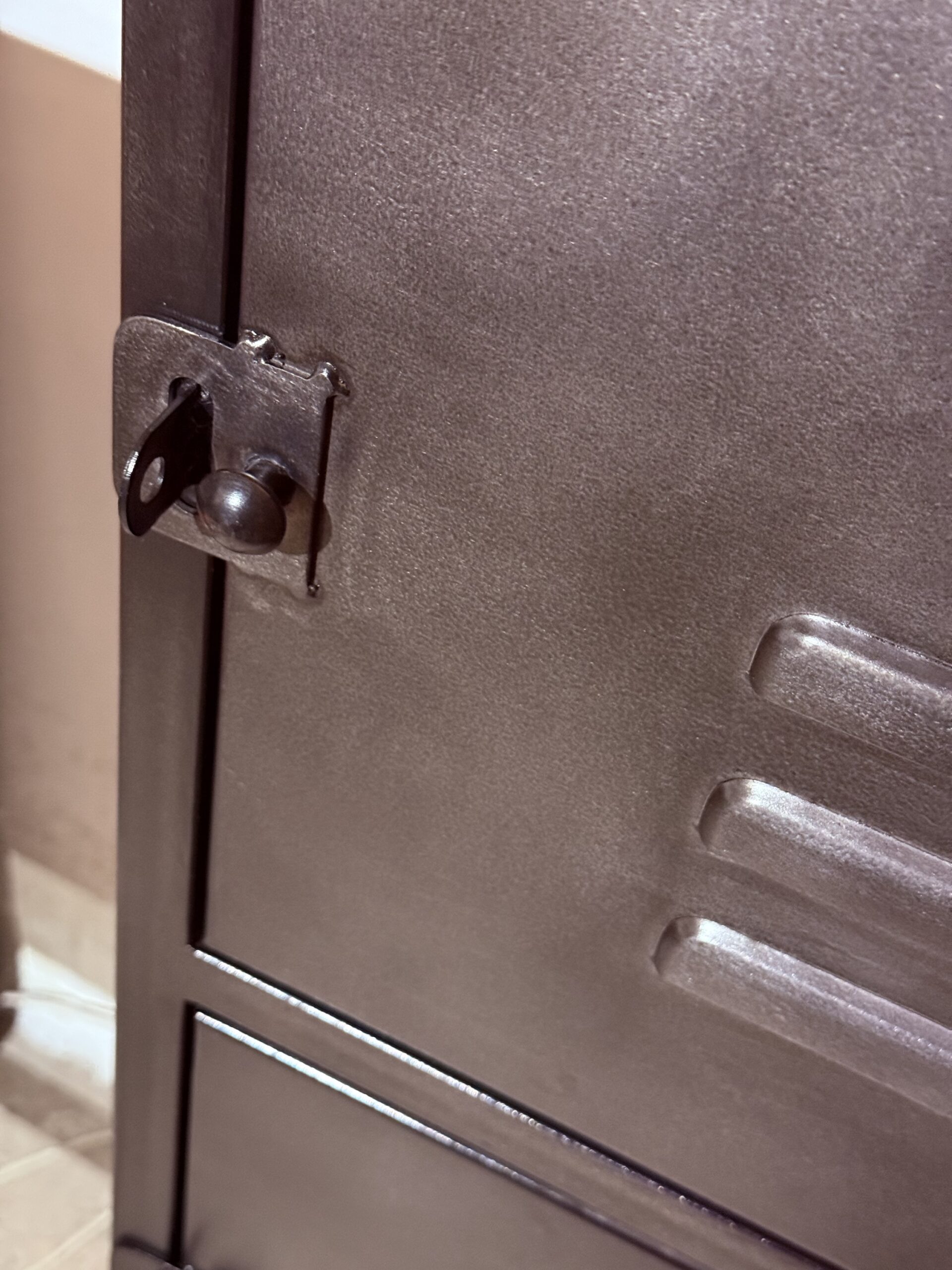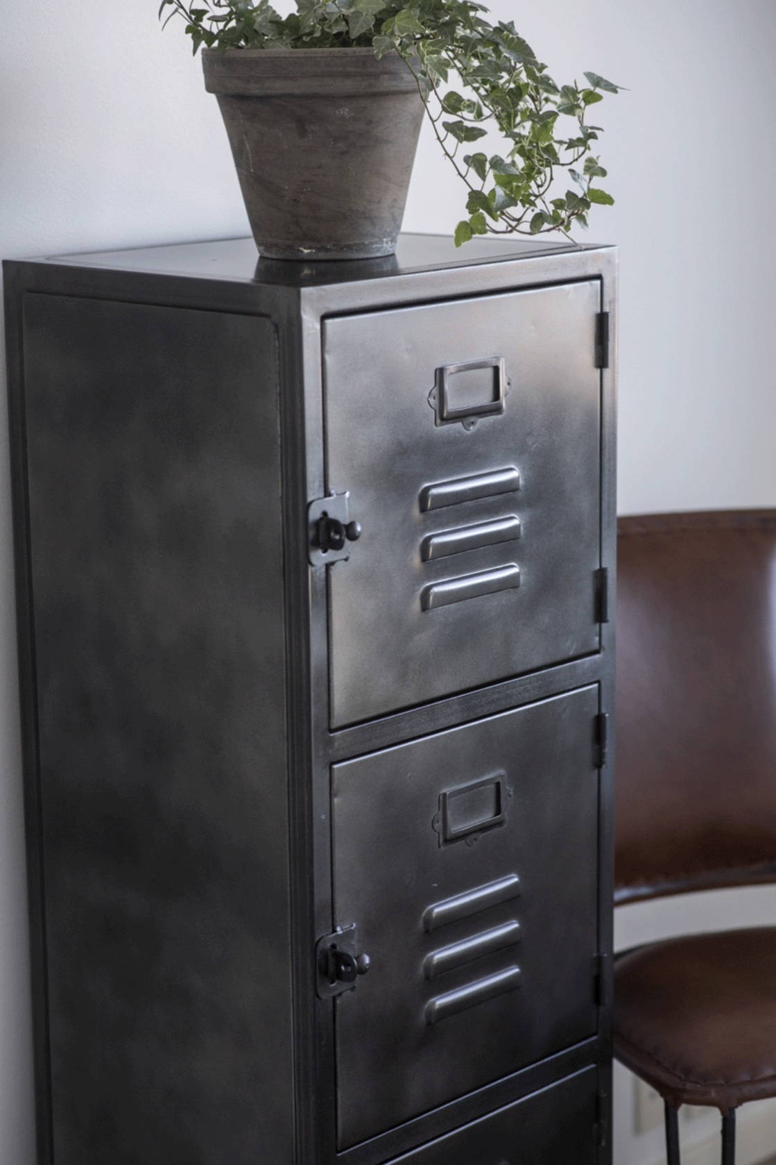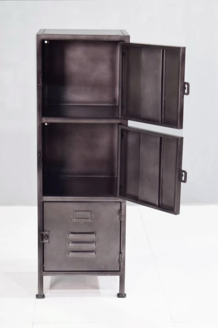 Gediget plåtskåp med tre skåpsluckor.