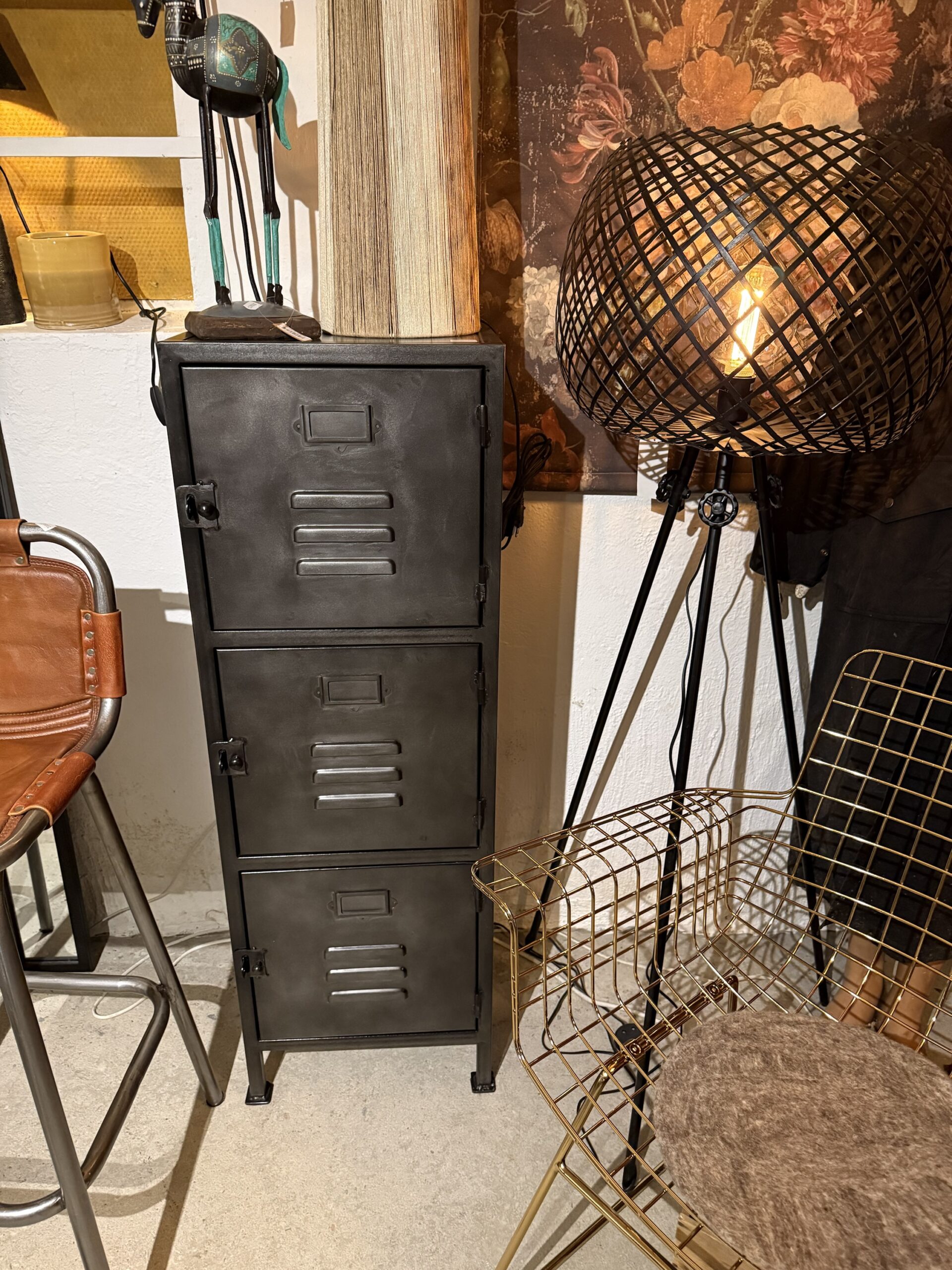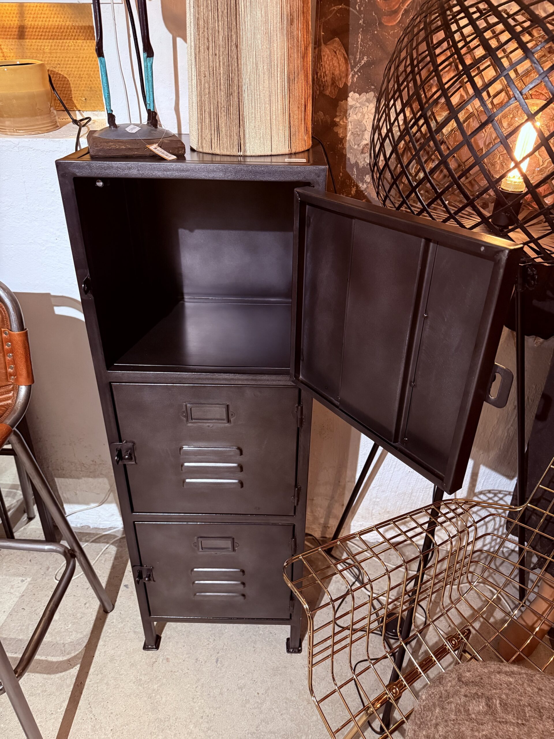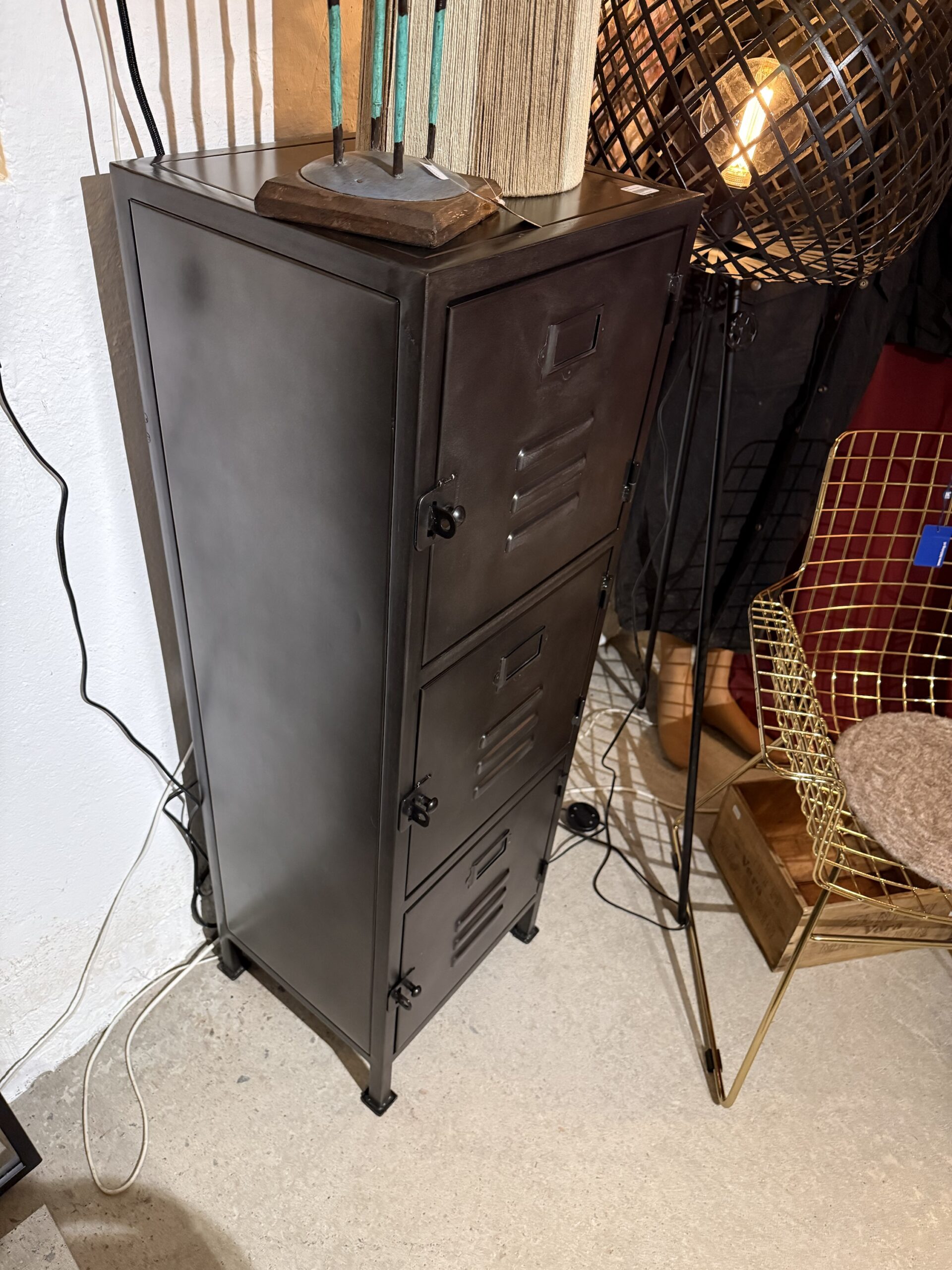 Gediget plåtskåp med tre skåpsluckor.